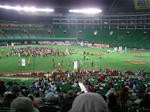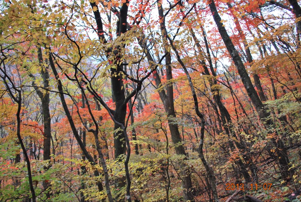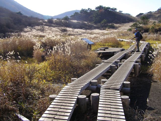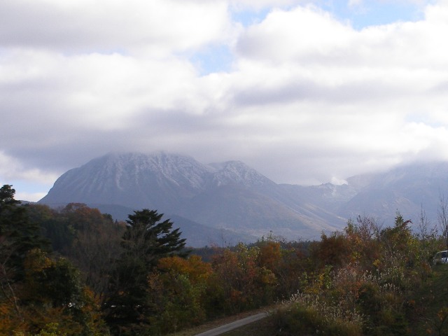 数日前から雨の予報が出ていたため随分気をもんだが、前日には劇的な変化があり傘マークが完全に消え昼からは晴れるとなったので全員に予定通り決行を連絡する。朝7時会社OB11名で紅葉を求めて九重に向った。吉部登山口から9時40分歩き始めた。10分ほど山の空気を味わいながら快適に進みやがて直登にかかる。このコース最大の難関だが20分ほどの辛抱と言い聞かせて登り始めたが昨夜降った雨のため非常に滑りやすい。注意深く手で木や根っ子を掴みながら慎重にゆっくり登っては休む。周りには紅葉した木があるが誰も観賞する余裕は無い。全員無事に登りきり一安心したが倍近い時間がかかった。私自信もこの坂がこんなに苦しいと思ったのは初めてで体力の衰えを痛感した。このあと暮雨の滝で休憩したりしながら順調に進む。平治岳が木々の間から見え始めると紅葉した木が現れ写真を撮る為ペースが落ちる。坊がつるは一面すすきの原で一同感嘆の声が上がる。りんどうの紫色も目立つ。数輪つけたミヤマキリシマが所々で見つかる。右に大きくそびえる三股山に次は登りたいと言い出す人がいる。やっと法華院温泉に着いたのが12時30分。天気予報通り雲ひとつ無い快晴になっている。土石流対策の工事車が沢山並んでいた。昼食後1時20分下山開始。雨ヶ池は新しく木道が付け替えられ、水が溜まって池になっている状態や草木を写した「雨ゲ池あんない」という掲示板が出来ていた。ここからの下り道はいろんな色の葉っぱによる絨毯の上を歩く。気分は良いが滑りやすいので注意。長者原手前にはまだ紅葉は残っていた。下山し終わったのが4時10分。随分と時間は掛かったが初めての人には充分堪能してもらえる山歩きだったと思う。早速12月は何処に連れて行ってくれますかと要望がかかった。