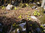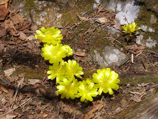 寒い冬を耐え忍んで咲き始める春の花には何故だか黄色が多いように感じるのだが、今日目指す福寿草もその黄色い花の一つ。熊本の山の達人から情報を頂き早速お世話になった。朝5時20分家を出て福岡から4人、7時過ぎに熊本で山の達人の車に乗り換え五木村を目指した。高速道の途中で山の上に顔を出す日の出を仰ぎ今日の幸運を祈る。氷川・宇城SICを降り3号線宮原から443号線へ、東陽町で25号線に入り大通越え・子鶴トンネルを通過し五木小川沿いを五木方面に向うと小さな「仰烏帽子山」の案内標識があり右折して橋を渡り登山口に上っていく。元井谷コースの登山口は既に車は一杯、少し上の特設された所も満杯。我々は私の体調のためにさらに上の第2登山口を目指したがここも30台くらい停まっているか空地が無い。止むを得ず少し下がって道幅の広い所に駐車する。雲ひとつ無い快晴でしかも日曜日とあってさすがに人気の山だ、福寿草を求めて九州一円の県名が付いた車が並んでいる。咲いている場所は1,200mあたりだが駐車場はすでに1,000mを越えている。登山口には約50分と書いてあるのでそれほど無理をしなくても登れるかな思っていたがやっぱりキツかった。5分登っては休みまた5分で休みの繰り返しで50分のところを1時間20分もかかってしまった。それでも連れて行ってもらって良かった。福寿草は小さな花びらだから一つや二つあっても目立つ花ではないが、これだけ群生していると見事で「ワーワー」歓声が上がる。保護のために足の下ろし場所を注意しながら近付いて写真を撮ったりした。花の数同様人も多い。福寿草は日が射さないと開かないそうなので天気予報を見て快晴の今日しかも日曜日とあって集中したのだろう。今朝早かったので11時過ぎ展望の良い場所で早めの昼食をとった。眼前には韓国岳その左雲の間に高千穂の峰が少し顔を出していた。その下は雲海が広がって花もいいが遥か遠くの展望も又絶景だ。名残り惜しみながら12時前に下山開始。1時には無事に駐車場に降りついた。登りも下りも皆さんに迷惑をかけてしまったけど昔からの山の仲間としてごめんなさいでゆるしてもらおう。特に熊本の達人にはわざわざ下見をして今日が最高だとして設定をしていただいた事に感謝。帰りは五木温泉に入って疲れを癒し、道の駅「子守唄の里五木」に寄ったあと6時頃福岡に帰り着いた。明日は雨の予報だが信じられない快晴の一日だった。